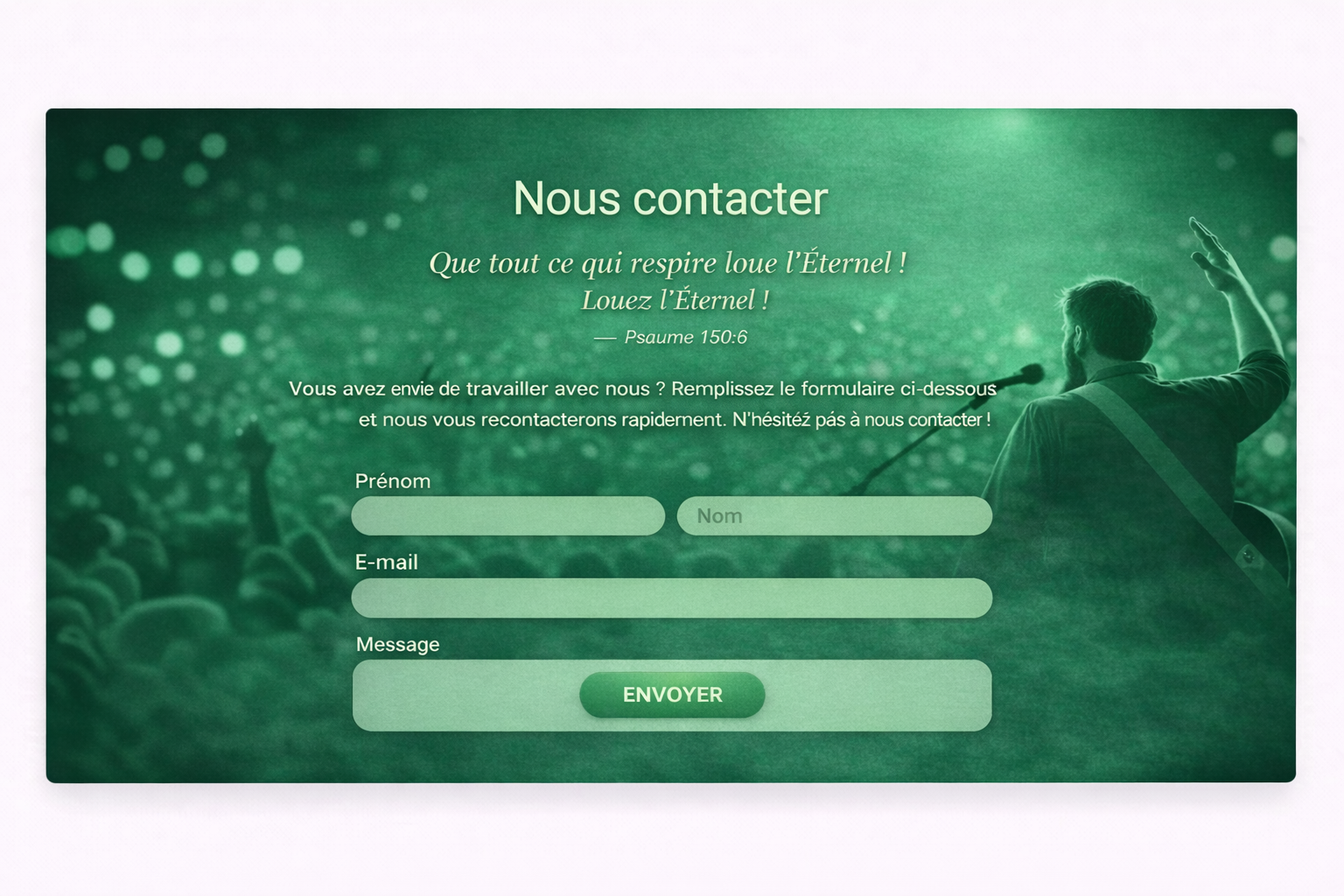 Notre vision est de former une génération d’adorateurs enracinés dans la foi, compétents dans leur art et engagés à servir Dieu avec intégrité, maturité et excellence.